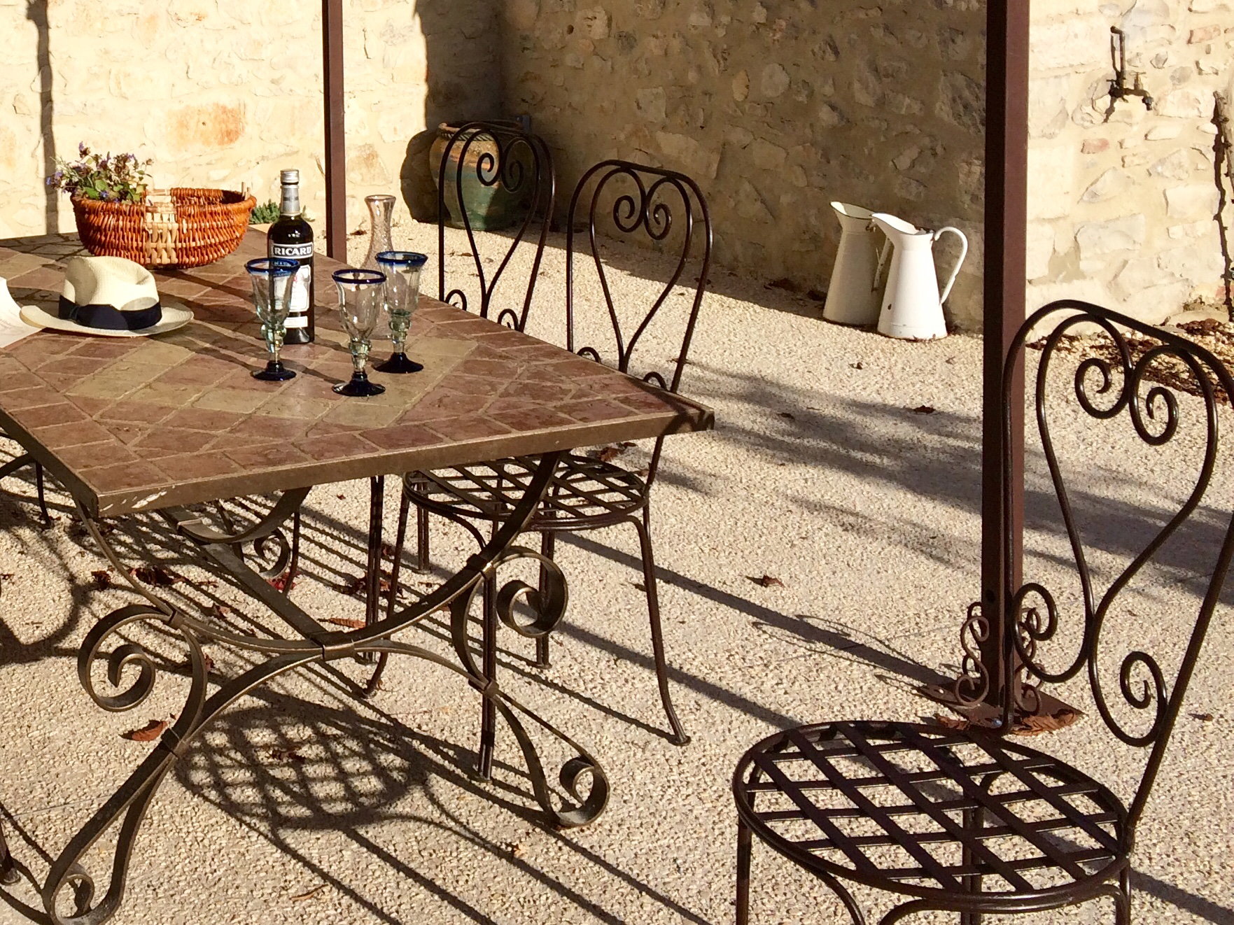 Un salon extérieur sous une tonnelle végétalisée avec une vigne vierge